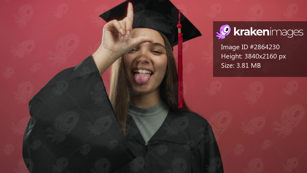 Girl wearing graduation cap sticks tongue out and makes l sign on forehead in studio; playful pride.