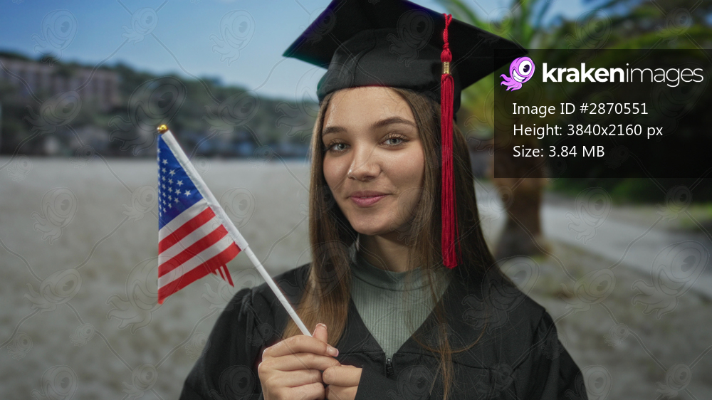 Girl wearing graduation gown and mortarboard holding united states flag on street; pride achievement success.