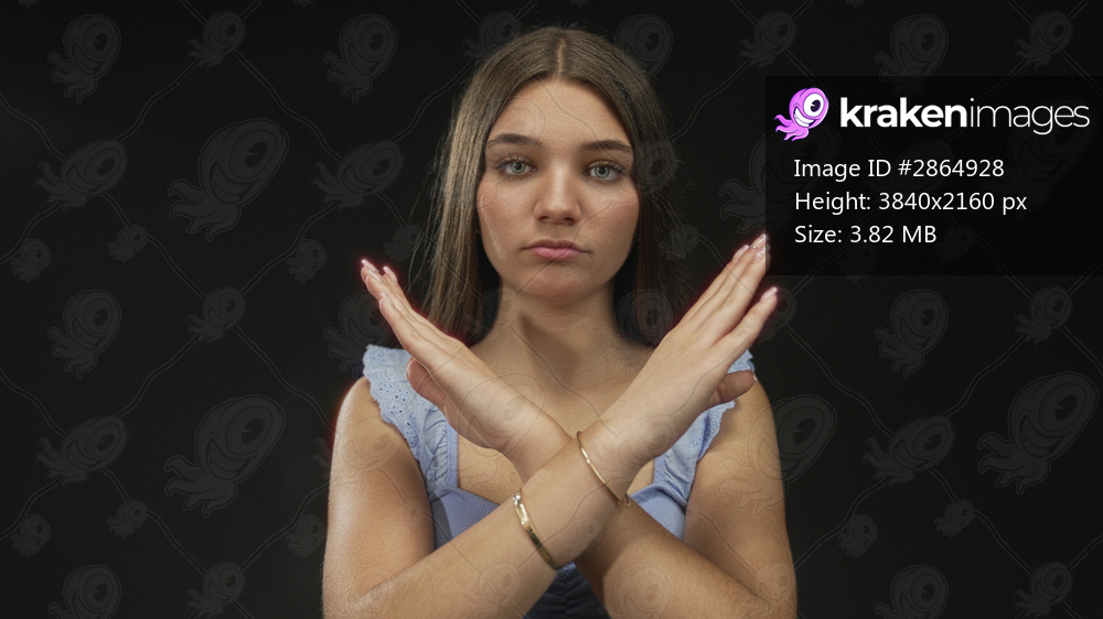 Girl wearing light blue tanktop crosses bare arms in black studio while pursing lips and making direct eye contact; defiance.