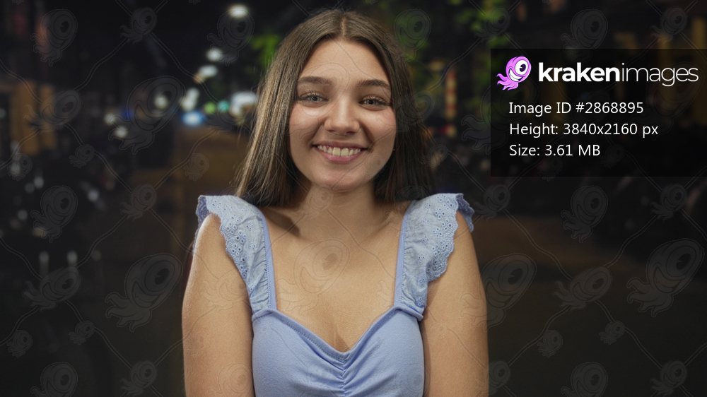 Girl wearing light blue top with bare shoulders smiling warmly on busy city street at night; carefree joy.