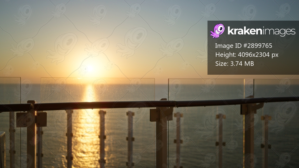 Glass railing with softly blurred ocean sunset and golden sun reflection on water outdoor; background backdrop copyspace calm.