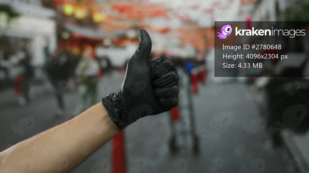 Gloved hand giving thumbs up gesture on busy city street with blurred people walking in background, emphasizing positivity and cooperation.