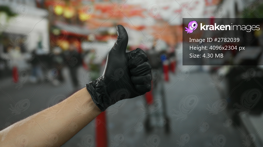 Gloved hand giving thumbs up gesture on busy city street with blurred people walking in background, emphasizing positivity and cooperation.