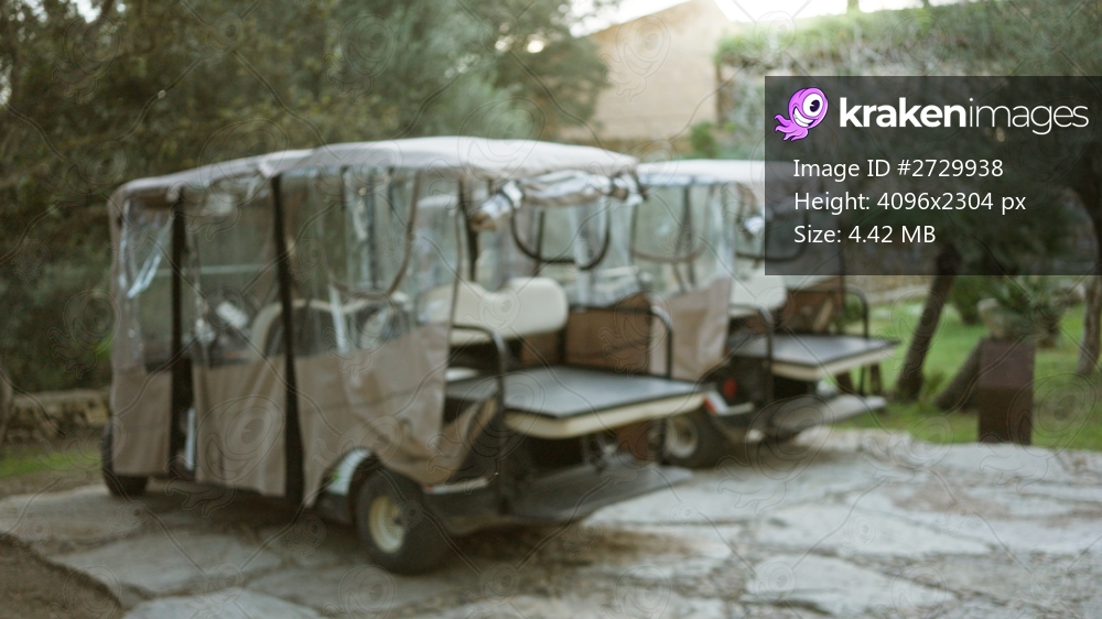 Golf carts parked in a blurry, bokeh-rich hotel setting create a peaceful ambiance, with the defocused landscape enhancing the serene atmosphere of the location. - Kraken Images