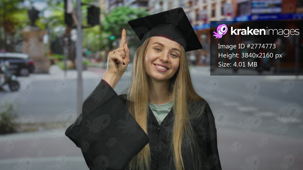 Graduate woman in cap and gown smiling outdoors on a city street, raising her index finger in a celebratory gesture of achievement.