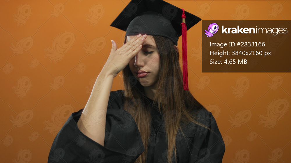 Graduated hispanic woman in cap and gown holds her hand on forehead with mortar board in studio; frustration stress fatigue disappointment.