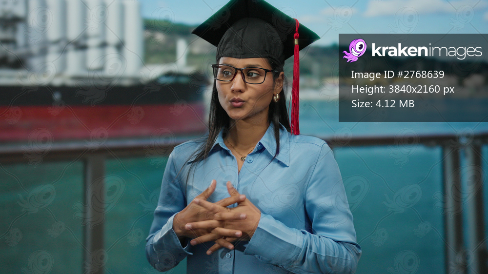 Graduated latin woman standing on a cruise ship deck, wearing a cap and gown with a scenic outdoor background.