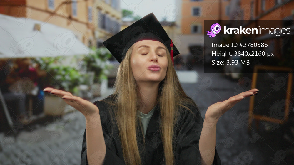 Graduated woman in a cap and gown sending a kiss in a lively city street with colorful buildings.