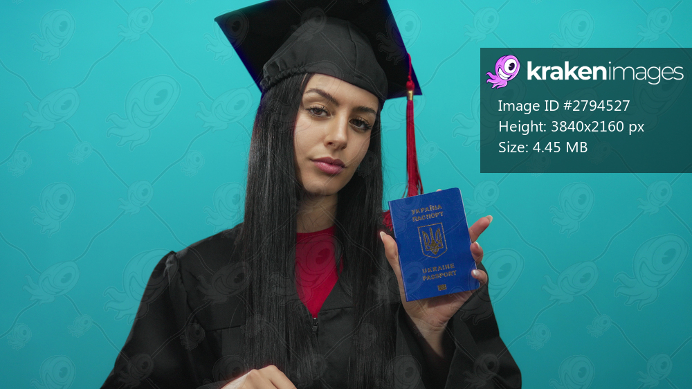 Graduated woman in cap and gown holds ukrainian passport against isolated green background, symbolizing new academic journey and travel opportunities.