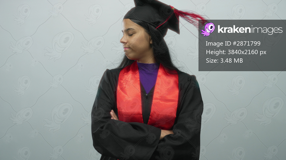 Graduated woman in mortarboard and black gown with red stole crosses arms in studio with light gray background; pride success achievement.