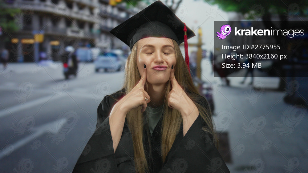 Graduated woman smiling in cap and gown on a busy city street, embodying joy and success, with urban life bustling in the background.
