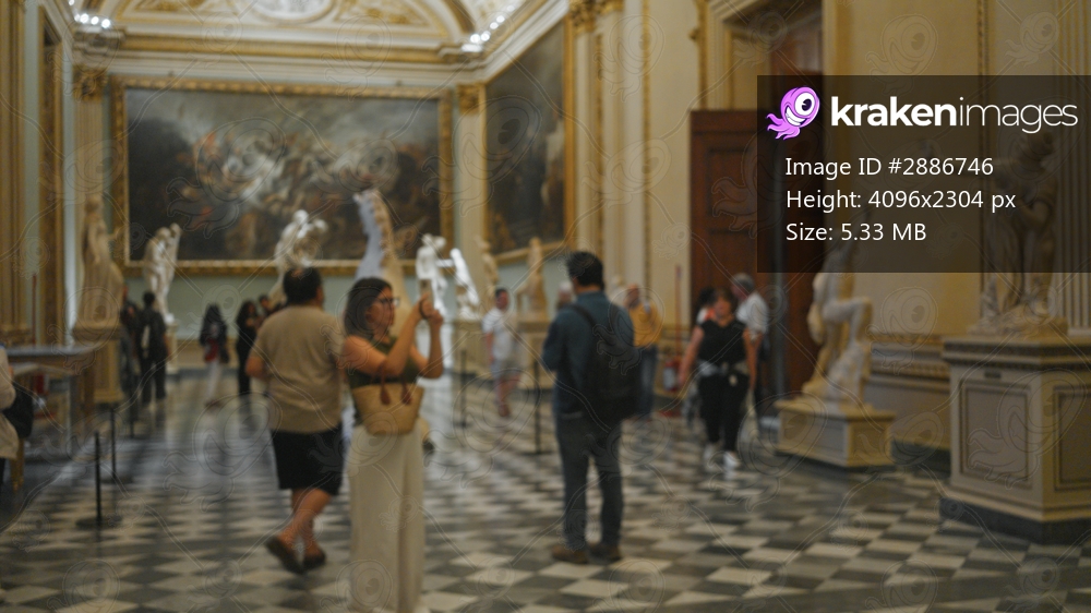 Grand museum interior in soft defocused bokeh with blurred marble sculptures, large framed paintings, ornate gilded ceiling and checkerboard floor; background backdrop copyspace calm. - Kraken Images
