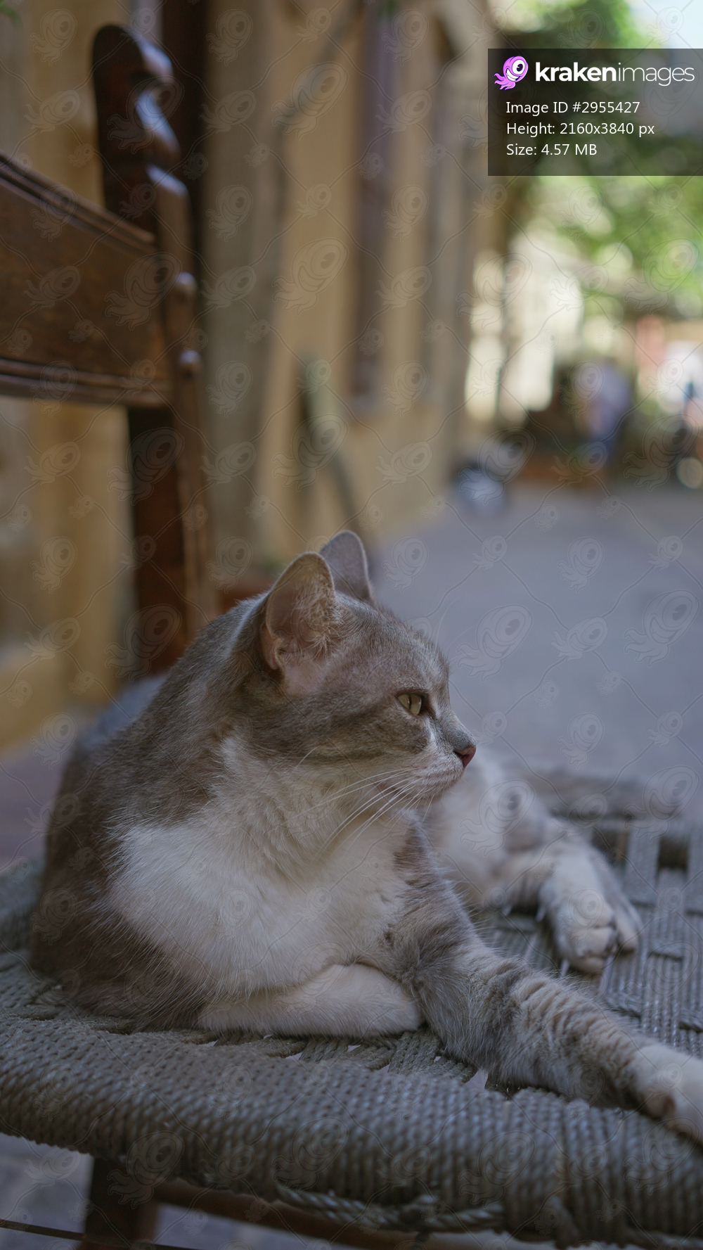 Gray tabby cat reclining on woven chair seat, green eyes gazing, front paw resting on chair edge, street; quiet curiosity.