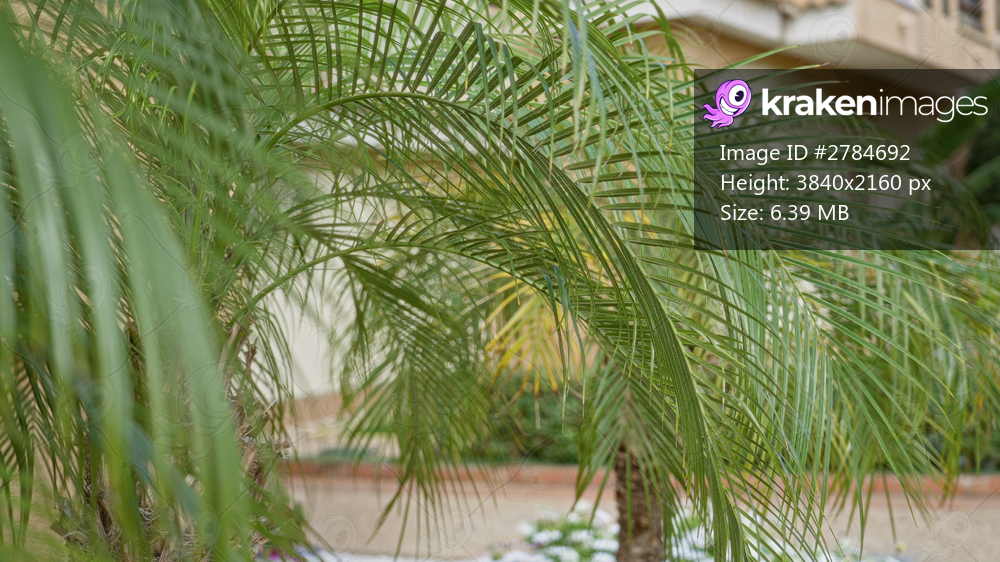 Green palm foliage outdoors in sunny torrevieja spain showcasing lush tropical plant life against blurred building backdrop emphasizing vibrant summer atmosphere - Kraken Images
