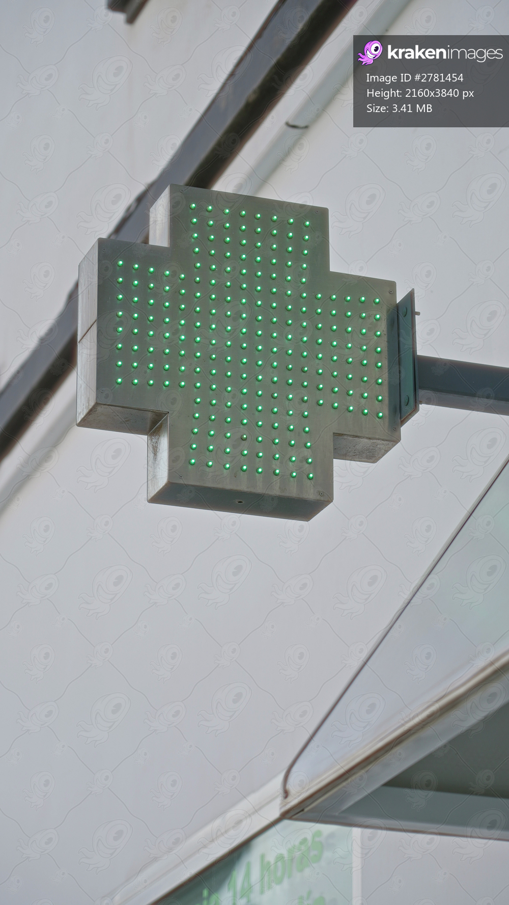 Green pharmacy cross sign glowing outdoors against a clear sunny sky, mounted on a wall near a building corner.