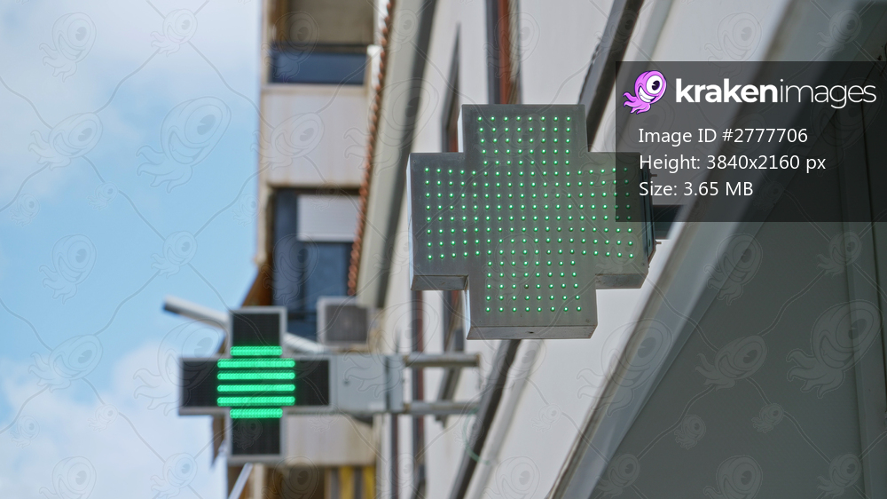 Green pharmacy signs with led cross symbols hang on building walls in a sunny outdoor urban area indicating nearby pharmaceutical services.