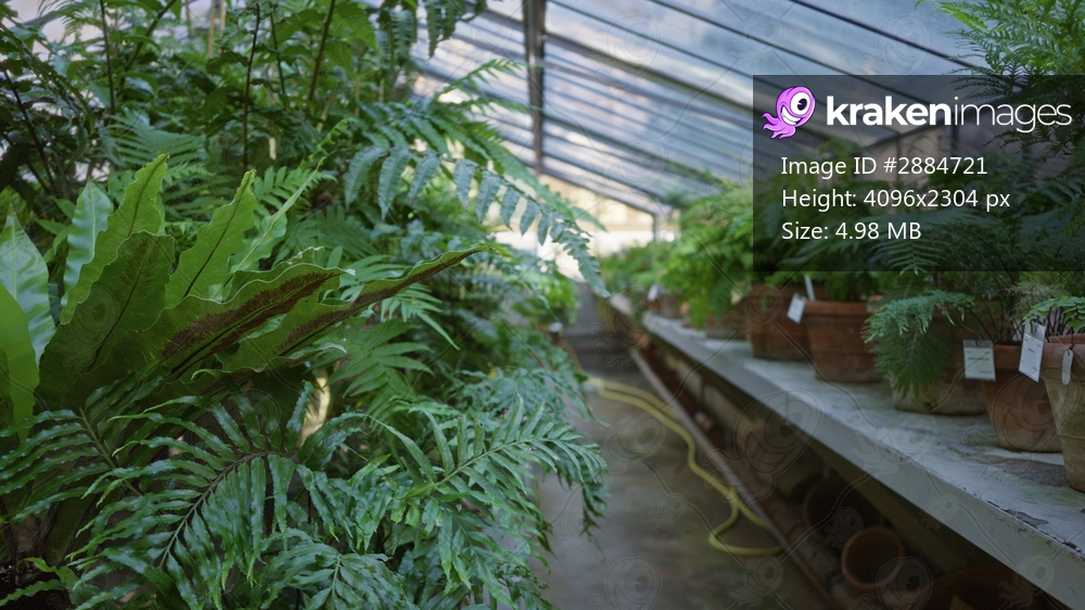 Greenhouse aisle with shallow focus on foreground ferns and blurred potted rows in a garden; backdrop copyspace backplate template.