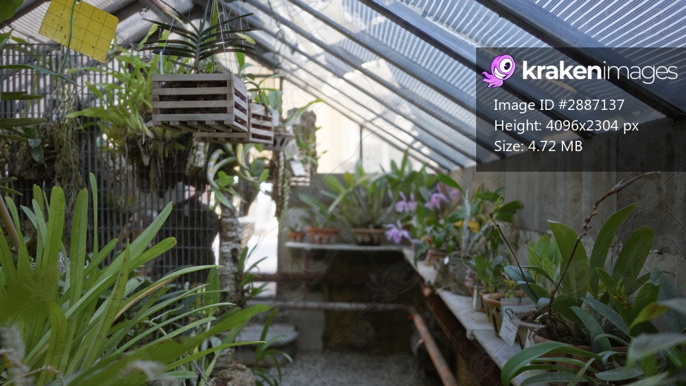 Greenhouse interior filled with potted orchids, hanging planters and leafy foliage, shallow focus with soft bokeh toward the rear, garden; background copyspace calm.