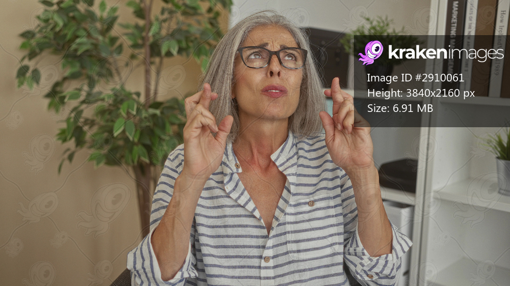 Grey haired middle age woman wearing glasses crosses fingers in office near bookshelf and potted plants while looking up; hopeful.