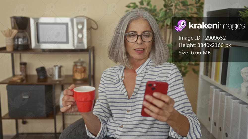 Grey haired middle aged woman holding smartphone and red mug, looking at screen with hand gripping cup, seated in office building; concentration routine. - Kraken Images