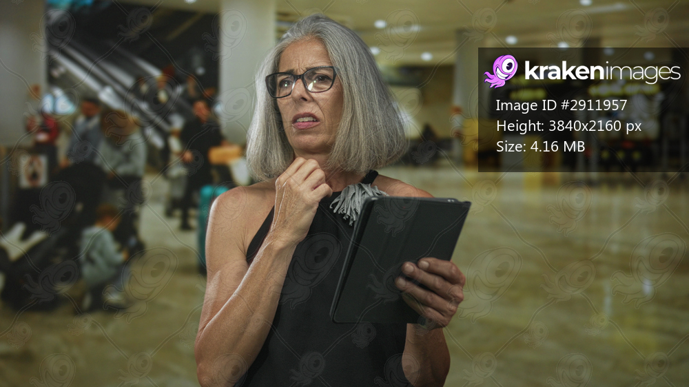 Grey haired middle aged woman holding tablet with hand on chin in airport terminal indoors, wearing glasses and reading screen with a puzzled expression; concern. - Kraken Images