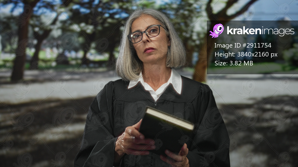 Grey haired middle aged woman judge in robe wearing glasses holds book to chest in forest amid trees and path; authority duty.