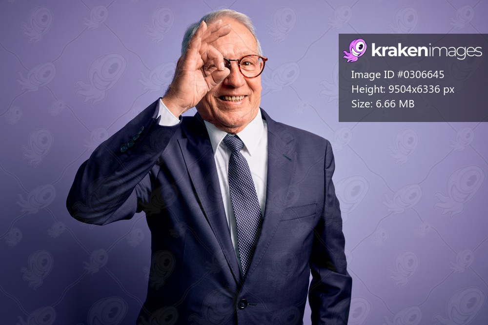 Grey haired senior business man wearing glasses and elegant suit and tie over purple background doing ok gesture with hand smiling, eye looking through fingers with happy face. - Kraken Images