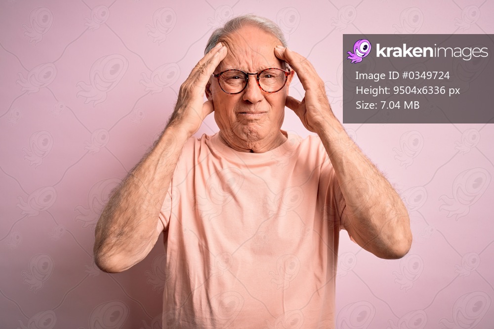 Grey haired senior man wearing glasses standing over pink isolated background suffering from headache desperate and stressed because pain and migraine. Hands on head. - Kraken Images