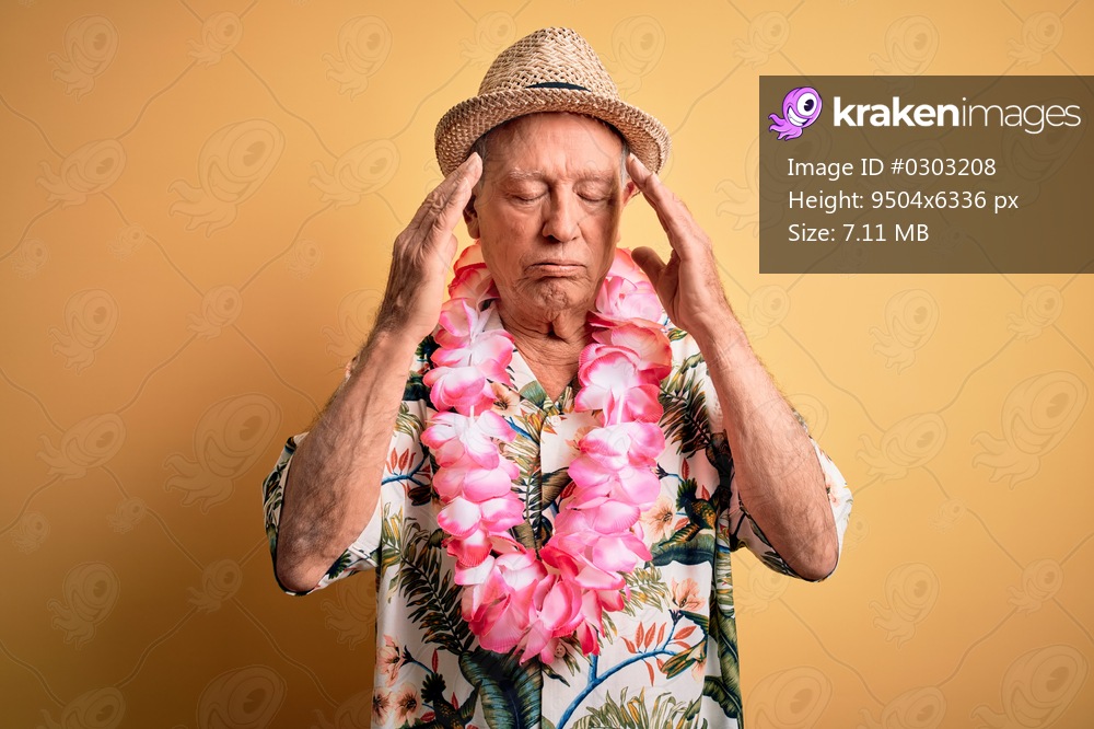 Grey haired senior man wearing summer hat and hawaiian lei over yellow background with hand on head for pain in head because stress. Suffering migraine. - Kraken Images