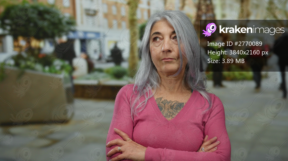 Grey-haired senior woman with arms crossed in an outdoor city street, suggesting confidence and strength amidst the urban environment, wearing a pink sweater and tattoo. - Kraken Images
