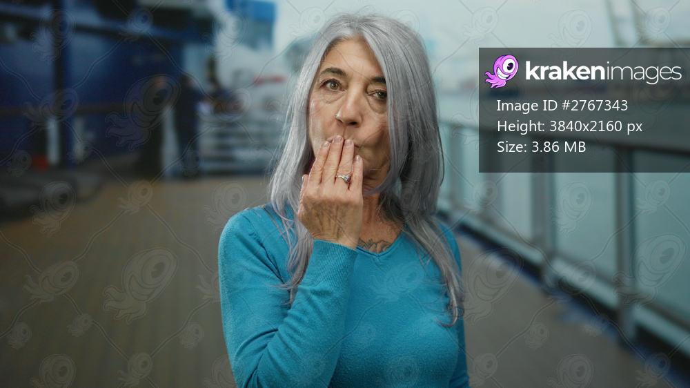 Grey-haired senior woman blows a kiss to the camera on a seaside cruise, with a smile, enjoying a relaxing outdoor moment on the boat.