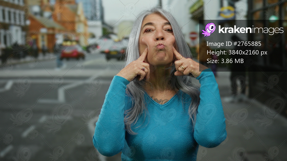 Grey-haired senior woman making a playful expression on a busy urban street, showcasing street life with cars and pedestrians in the background.