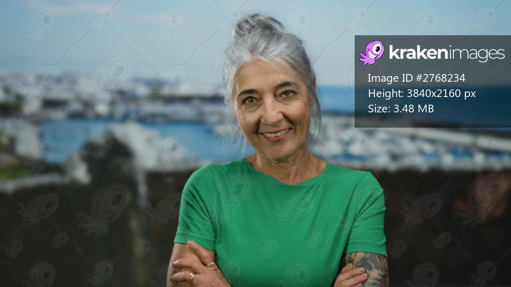 Grey-haired senior woman with tattoos and green shirt crosses arms at seaside port, smiling with boats and ocean in the background under a clear blue sky. - Kraken Images