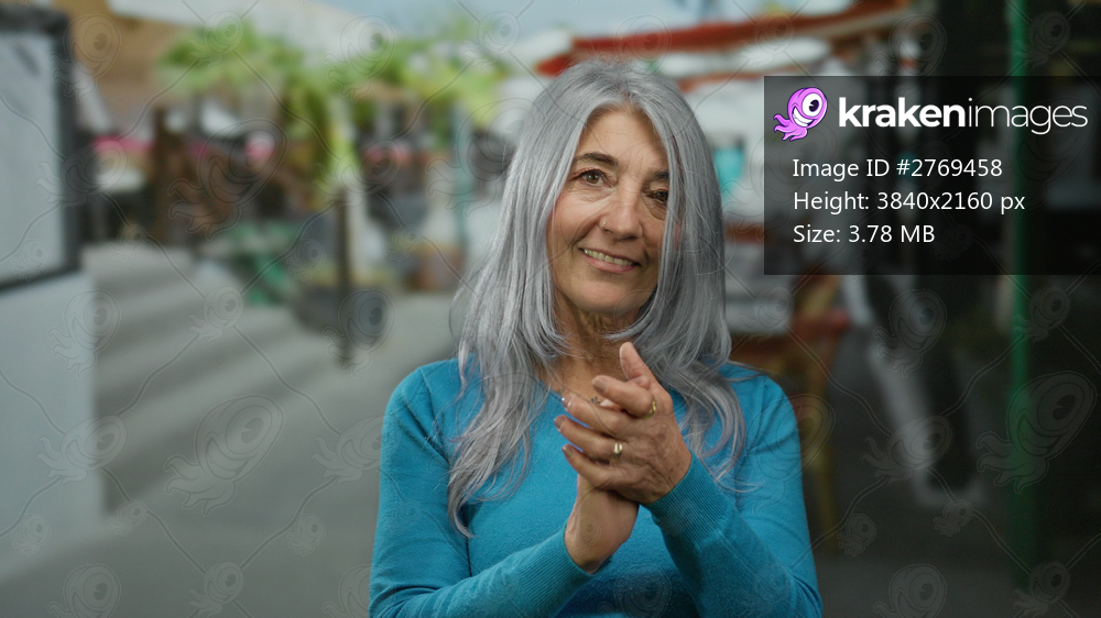 Grey-haired woman clapping hands outdoors on a vibrant street, expressing happiness and positivity, wearing blue sweater with a blurred background of shops and cafes. - Kraken Images