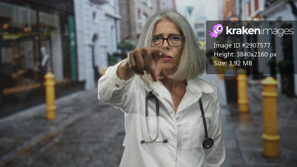 Grey haired woman doctor with stethoscope raising arm to hail on a narrow city street; concern medical help.