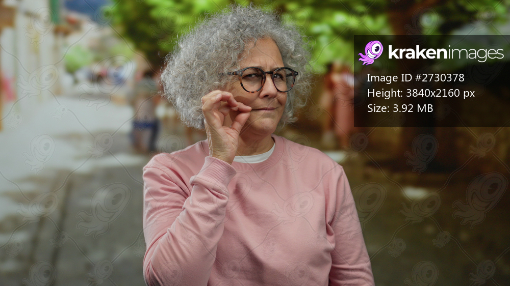 Grey-haired woman gestures outdoors on an urban street wearing glasses and a pink sweater, conveying expression amidst city surroundings, blending with an urban environment. - Kraken Images