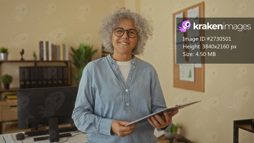 Grey-haired woman in office holding clipboard, standing near desk with plants and documents, showcasing a professional workplace environment.