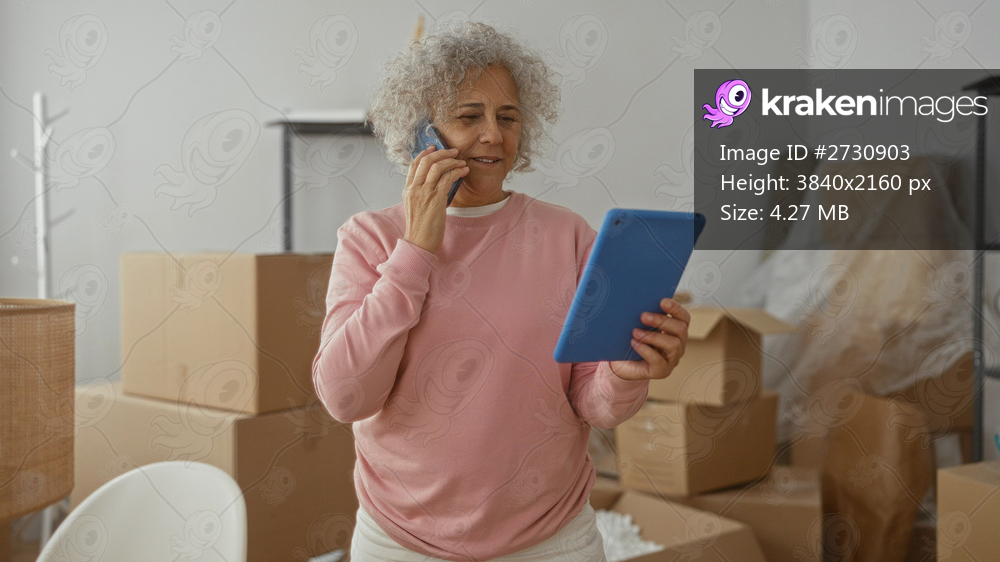 Grey-haired woman in pink sweater using tablet and talking on phone in living room surrounded by moving boxes in new apartment.