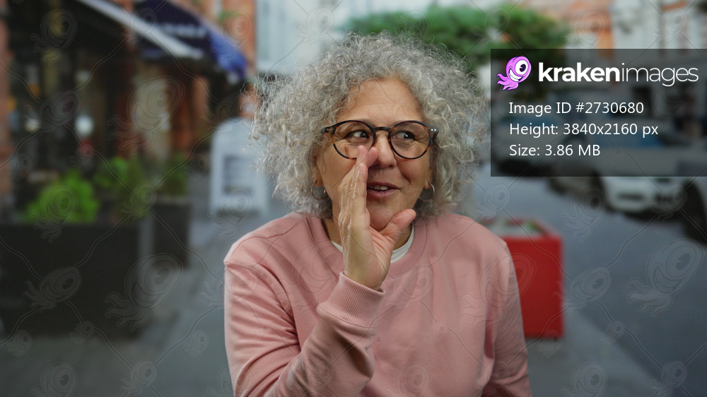 Grey-haired woman smiling and speaking in an urban street setting, capturing the essence of mature confidence and outdoor activity in a bustling city environment. - Kraken Images