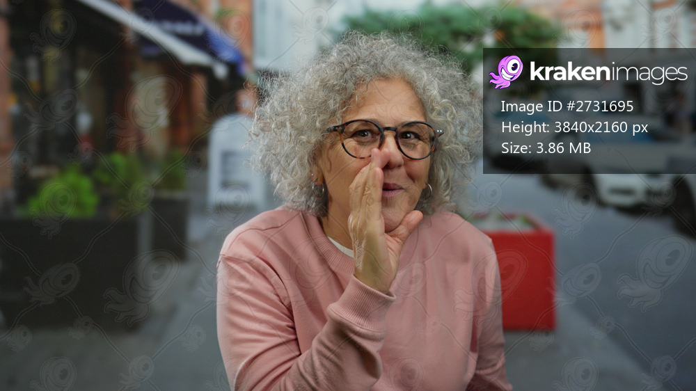 Grey-haired woman smiling and speaking in an urban street setting, capturing the essence of mature confidence and outdoor activity in a bustling city environment. - Kraken Images