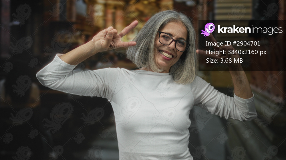 Grey haired woman smiling, wearing glasses, peace sign with both hands in church building; joy faith celebration.