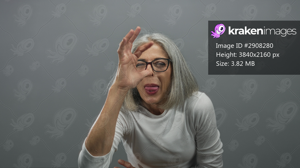 Grey haired woman sticking tongue out and reaching toward camera with hand gesture in grey studio; playful.