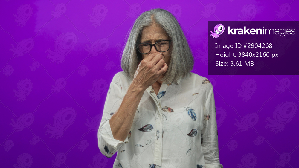 Greyhaired woman pinching nose and pressing bridge in purple studio wearing glasses and feather print blouse; disgust discomfort.