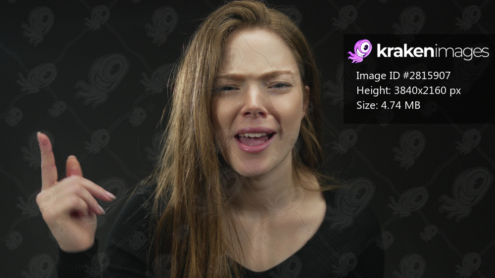 Grimacing young caucasian woman with long brown hair finger pointing in black studio setting; annoyance.