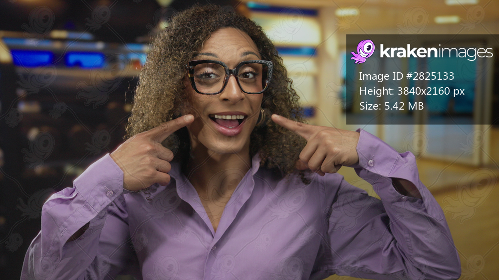 Grinning transgender woman in purple shirt finger pointing to cheek in indoor gym with mirrored wall; joy pride.