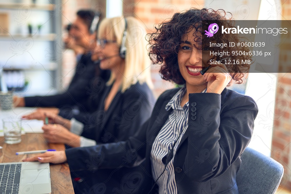 Group of call center workers working together with smile on face using headset. Young beautiful woman smiling at the office.