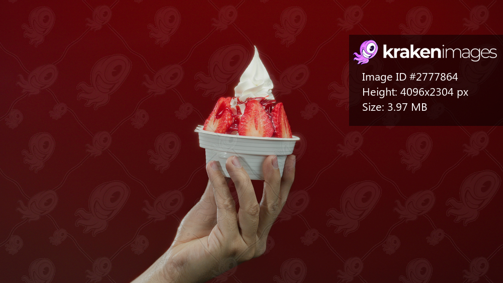 Hand holding a dessert cup with ice cream and strawberries against a red background, showcasing delicious food in a vibrant setting.