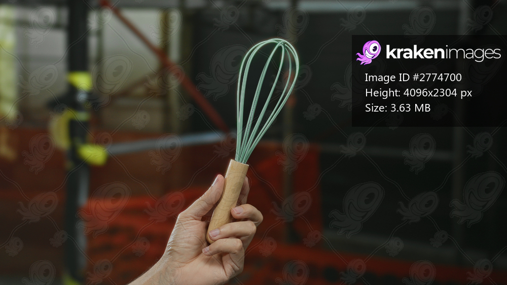 Hand holding a kitchen whisk at a construction site, highlighting a contrasting mix of culinary and industrial themes outdoors.