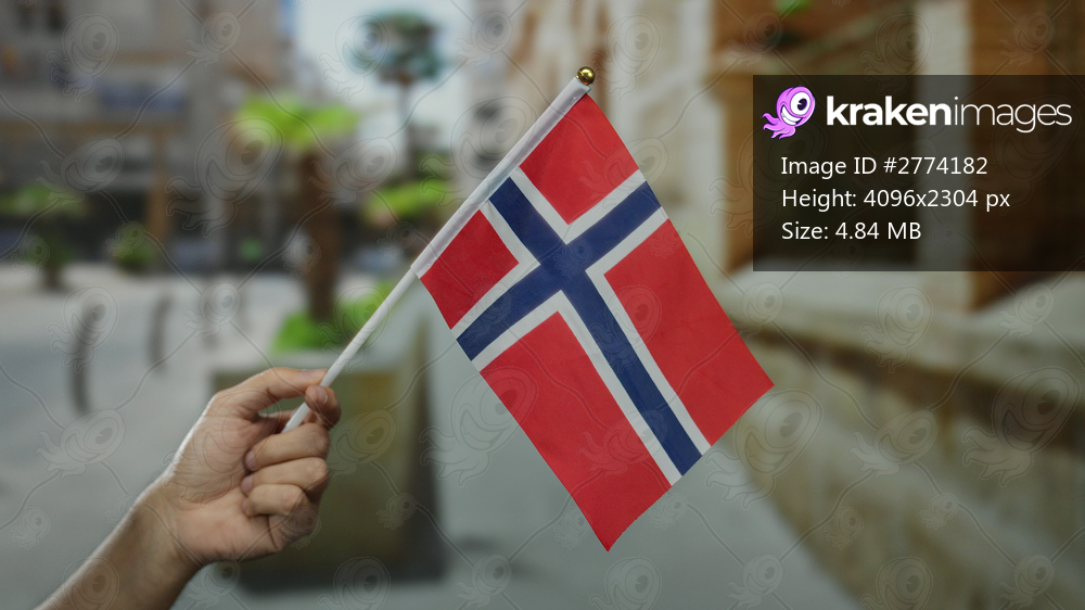 Hand holding a norwegian flag outdoors on a city street, symbolizing national pride and celebration with an urban backdrop.