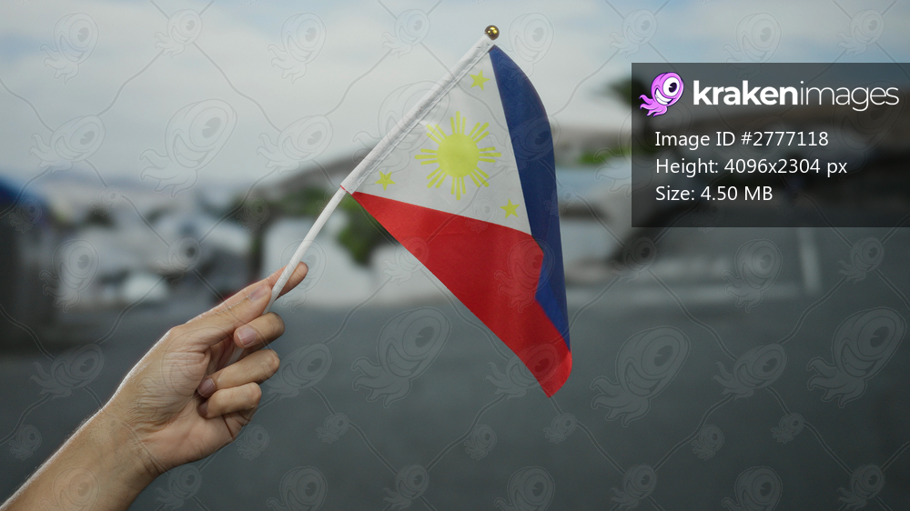 Hand holding a philippine flag on a city street, showcasing pride and culture in an outdoor urban setting.